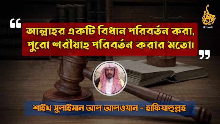 আল্লাহর একটি বিধান পরিবর্তন করা, পুরো শরীয়াহ পরিবর্তন করার মতো। শাইখ সুলাইমান আল আলওয়ান – হাফিযাহুল্লহ। আল্লাহর আইন পরিবর্তন করা মূলত আল্লাহর শারীয়াহ পরিবর্তনের-ই প্রতিরূপ। তাই যে আল্লাহর আইন পরিবর্তন…